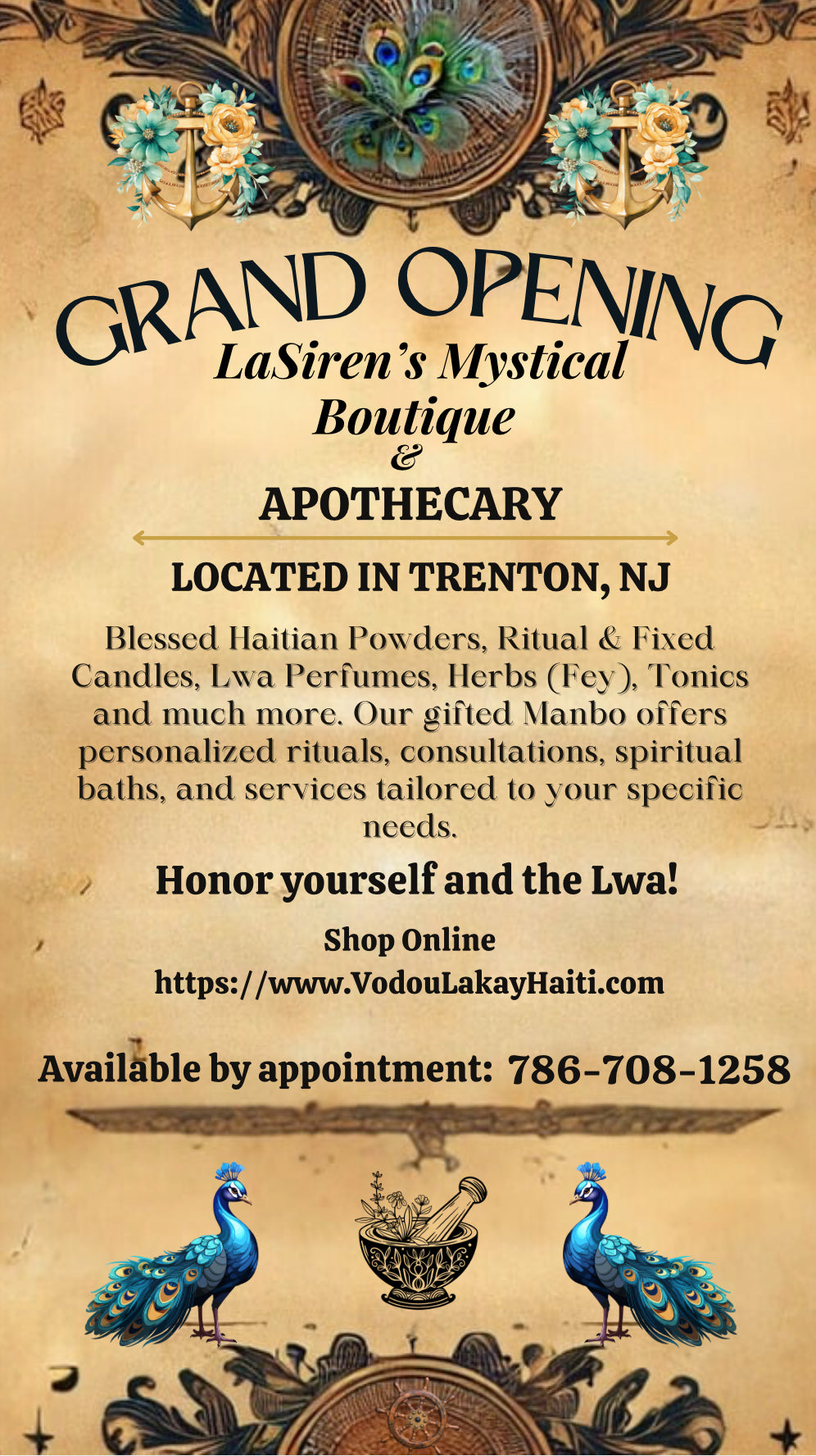 We are a Haitian American-owned, full-service Apothecary based in Trenton, NJ, dedicated to providing a unique selection of spiritual products. Our offerings include herbs, blessed candles, oils, and a variety of spiritual tools and altar supplies sourced directly from Haiti. Our mission is to support your spiritual journey with authentic and meaningful products rooted in Haitian tradition and spirituality.