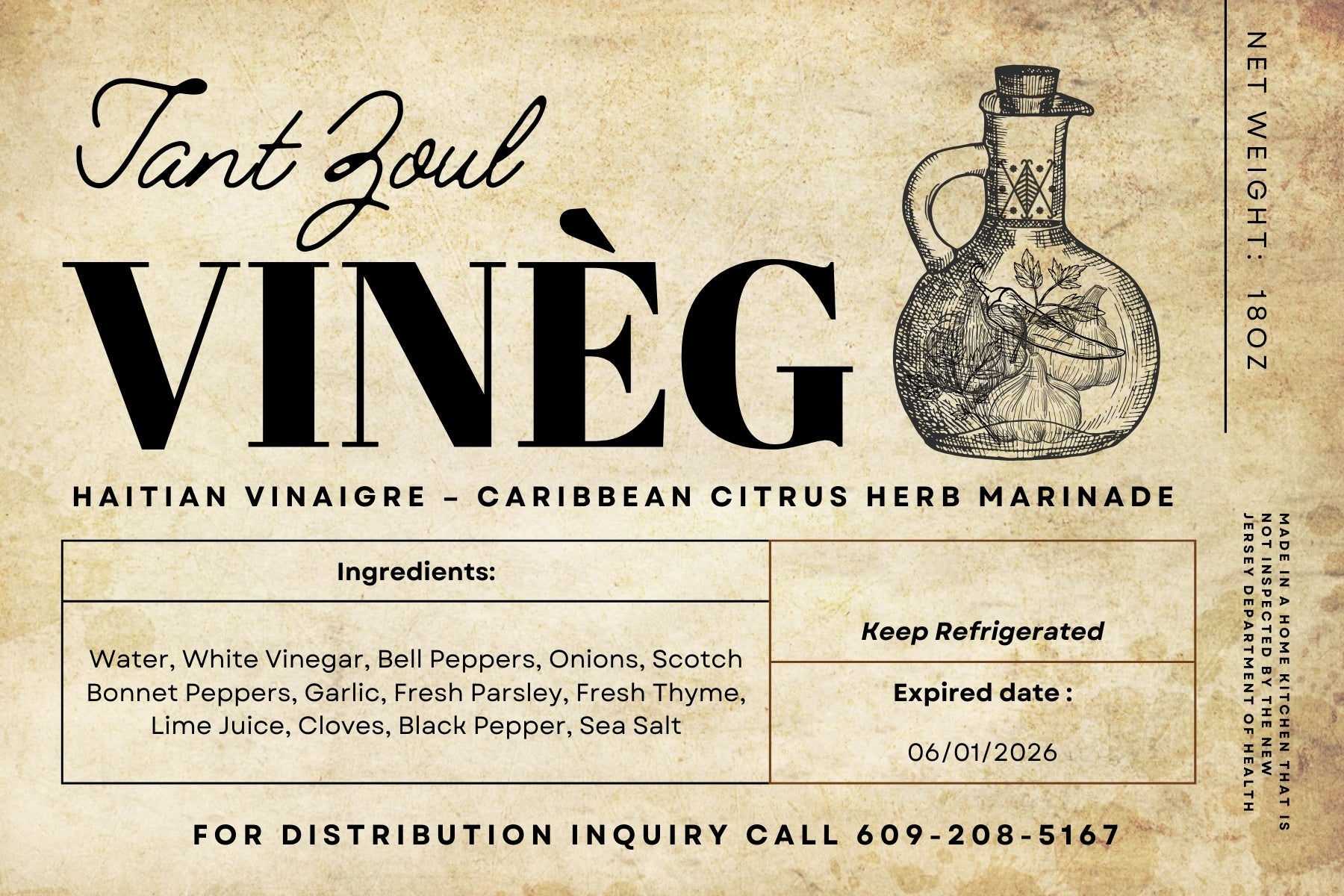 A bold, citrus-herb Haitian vinaigre made with Scotch bonnet peppers, garlic, thyme, parsley, and natural citrus. Tant Zoul Vinèg is an authentic marinade, vinaigrette, and seasoning base that brings depth, brightness, and tradition to any dish. Use on poultry, seafood, vegetables, or as a finishing splash for vibrant Creole flavor. Crafted in small batches and inspired by the ancestral kitchens of Haiti, each bottle reflects generations of technique and taste.