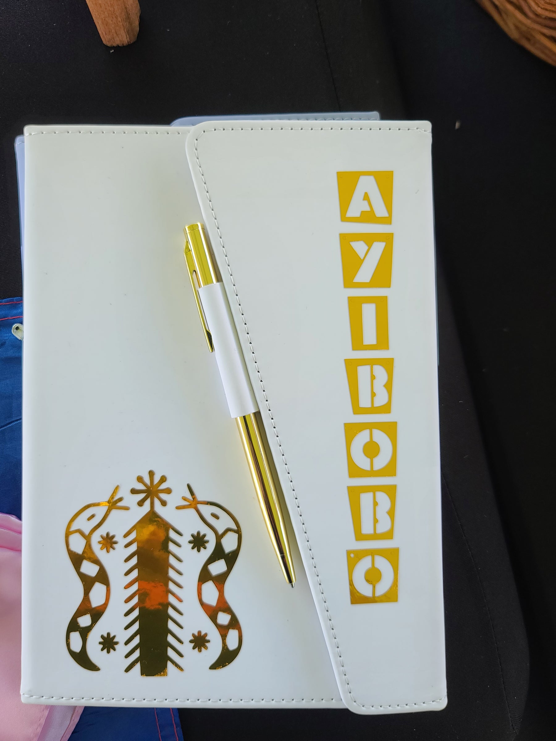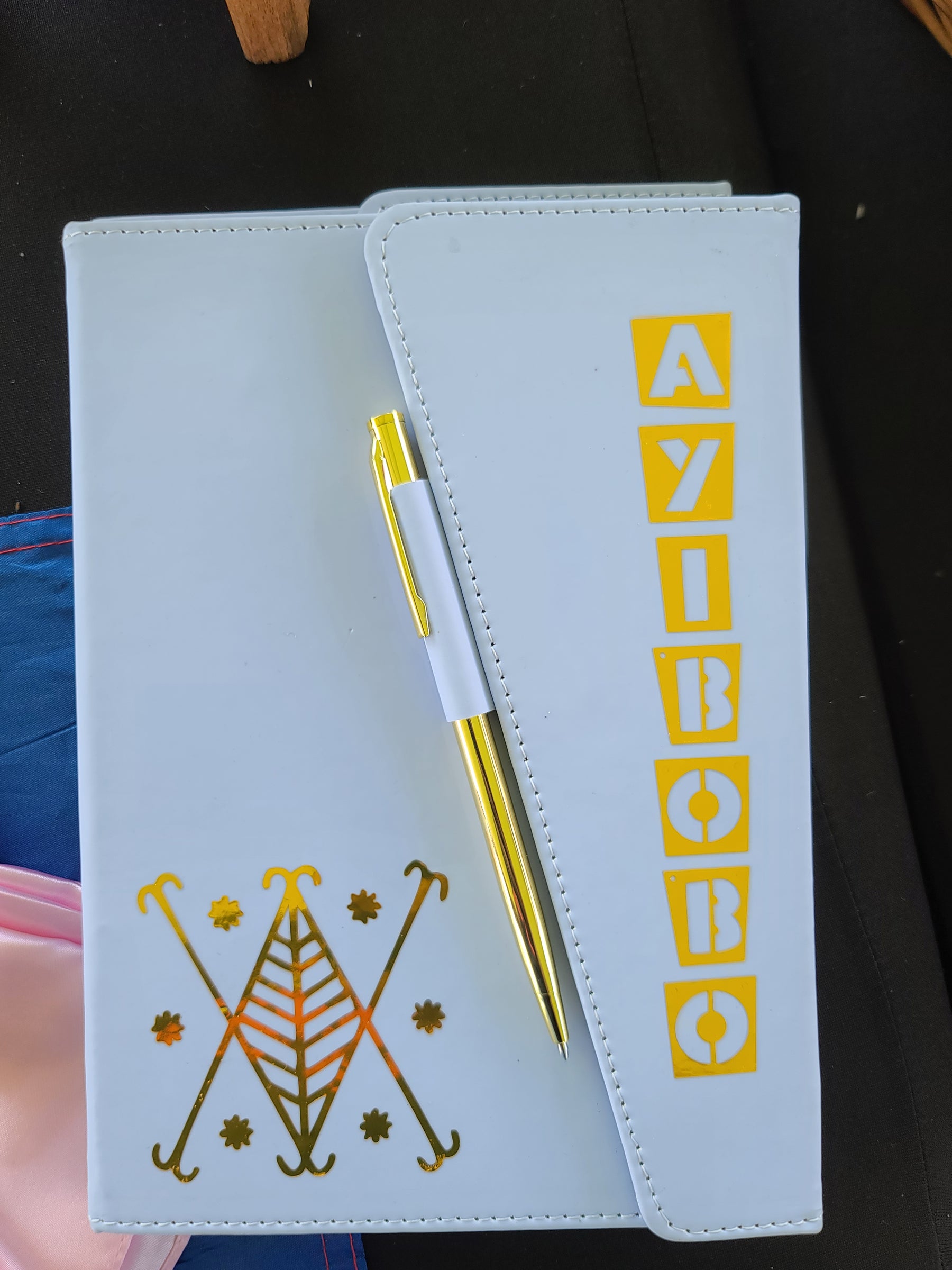 Honor your spiritual path with sophistication and pride. The Ayibobo Elegance Journal Set features a vibrant green and lime vegan leather journal adorned with a striking golden Vévé symbol representing divine strength and ancestral wisdom. The matching pen sleeve is stamped with “AYIBOBO” in bold, golden letters—an affirmation of faith, power, and respect in Haitian Vodou.